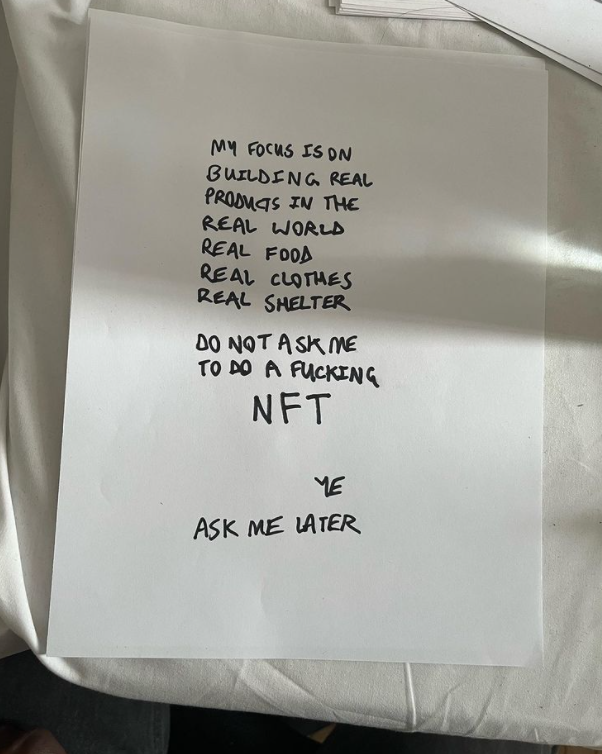 웨스트는 1일 자신의 SNS에 "나는 진짜 건물, 진짜 세상에서 만든 제품, 진짜 음식, 진짜 옷, 진짜 주거지에만 집중한다. 제발 그놈의 NFT 하냐고 좀 묻지마"라는 글이 적힌 사진을 올렸다.