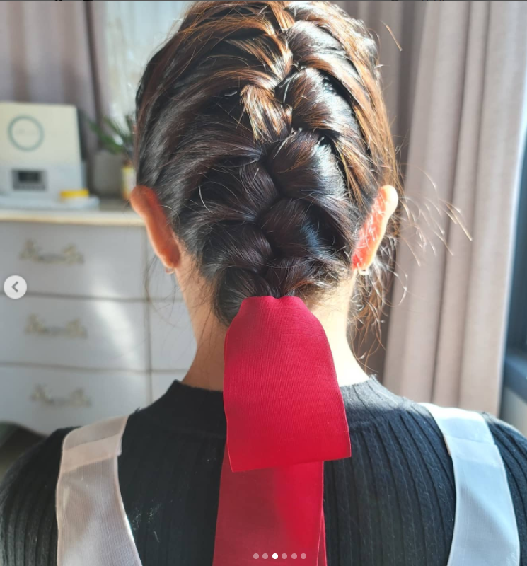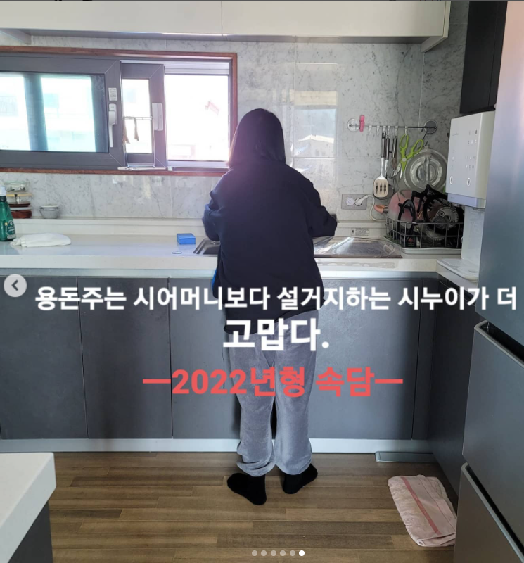 이어진 사진 속에서 장동민의 어머니는 한복을 입는 며느리를 위해 손수 일명 디스코 머리를 땋아주고 있다. 또 다른 사진에서는 듬직하게 설거지를 하고있는 시누이의 뒷모습이 담겨 있다.