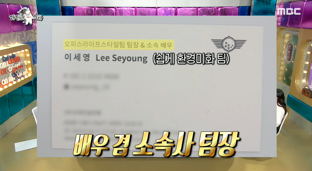 그런가 하면 소속사(프레인TPC)에서 오피스 라이프스타일 팀장을 맡고있다며 명함도 건넸다. 프레인에는 류승룡을 비롯해 엄태구, 오정세, 박지영, 이준, 김무열, 조은지, 조현철 등 쟁쟁한 배우들이 속해 있다.