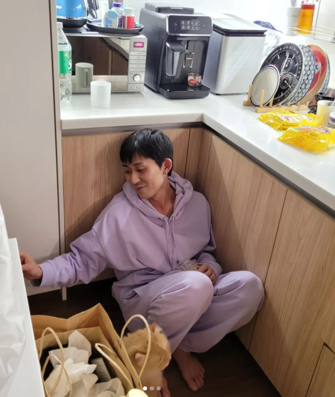 사진 속에서 코드쿤스트는 평소 가장 좋아하는 자리라던 싱크대 안쪽 바닥에 쭈그려 앉아 반려묘를 안고있는 모습이다. 맨발에 연보라색 추리링을 입고, 기안84의 카메라에 쑥쓰러워 미소를 짓고 있다.
