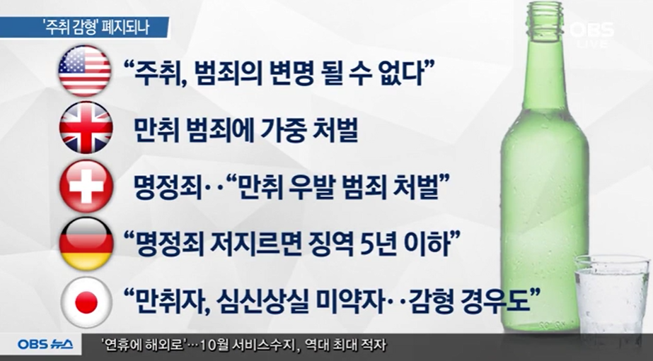 하지만 해외에서는 대부분의 국가가 만취자에 대해 예외조항을 두지 않는다. OBS‘뉴스오늘’ 최단비 변호사에 따르면 미국은 주취를 범죄의 변명으로 인정하지 않고, 영국은 만취범죄의 경우 오히려 가중 처벌을 한다. 스위스는 타의에 의해서가 아니라 자의로 만취해 벌인 범죄에 대해 처벌한다는 입장이다.