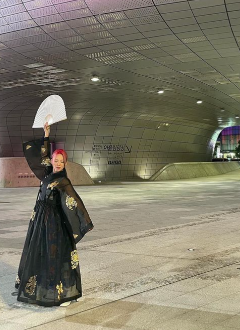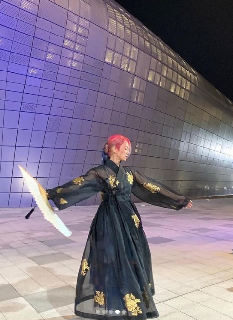 효연은 7일 자신의 SNS에 "우리나라 한복 아름답네"라는 글과 함께 서울 동대문구 동대문디자인플라자(DDP)를 배경으로 부채춤을 추는 모습을 공개했다.