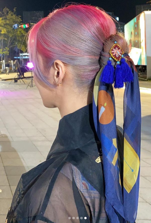 핑크색 머리에 스카프 스타일의 파란색 머리장식을 해 현대적인 재해석을 한 것도 눈길을 끈다.