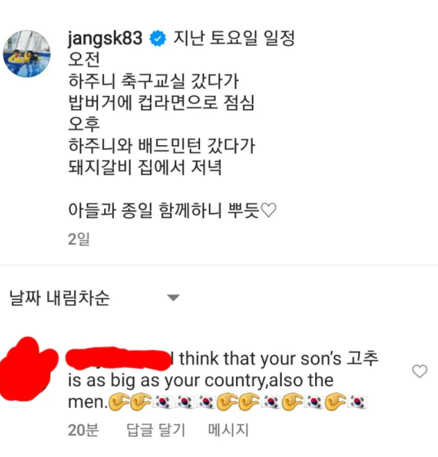 장성규는 8일 아들과 함께한 일정을 올린 게시물에 달린 악플을 공개했다. 성적 모욕이 담긴 손동작까지 넣어 장성규의 아이를 모욕하는 수준낮은 댓글이었다.