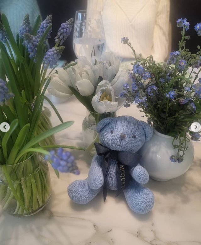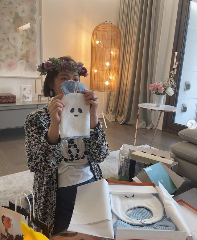 이어진 사진에서는 화관을 쓴 황정음이 지인들의 선물을 열어봤는데 하늘색 팬더 모자와 턱받이 등이 눈길을 끌었다. 또다른 사진에도 푸른색 곰인형이 등장해 둘째도 아들로 추정됐다.