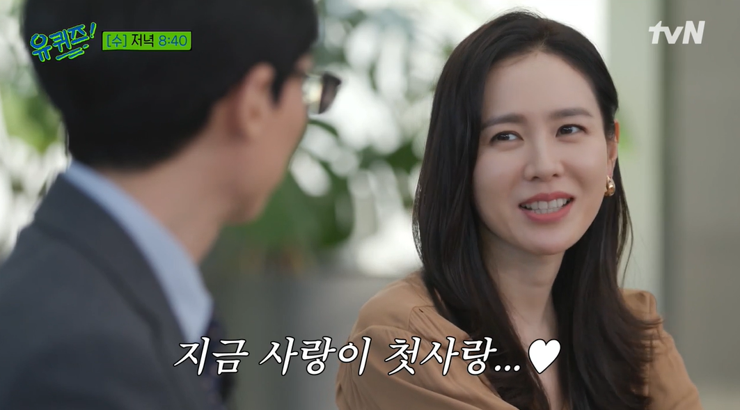 이에 이날 스페셜 MC를 맡은 이말년이 "근데 국민 첫사랑의 첫사랑은 누구냐?"고 물었고, 몹시 당황한 표정으로 눈을 굴리던 손예진은 "지금 사랑이 첫사랑"이라고 우문현답해 웃음을 자아냈다.