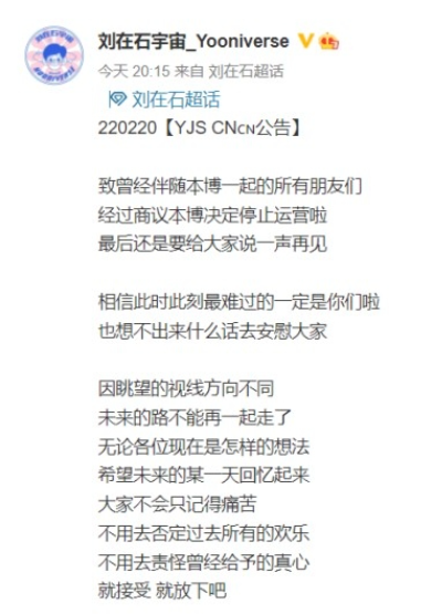 이 같은 모습이 방송되자 중국 내 유재석 팬클럽이 운영 중인 SNS '유재석유니버스' 웨이보는 "운영진과 논의한 결과 오랫동안 함께해 온 이 공간 운영을 중단하며 마지막으로 팬 여러분께 인사를 남긴다. 이 순간 가장 힘든 사람은 우리 팬들일 것이다. 어떤 말로도 위로할 수 없지만, 과거 그를 사랑하고 즐거웠던 마음까지는 자책하지 말자"라는 글을 올리며 웨이보 운영 중단을 선언했다.namsy@sportsseoul.com