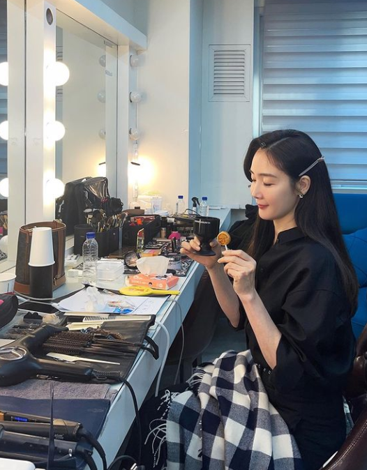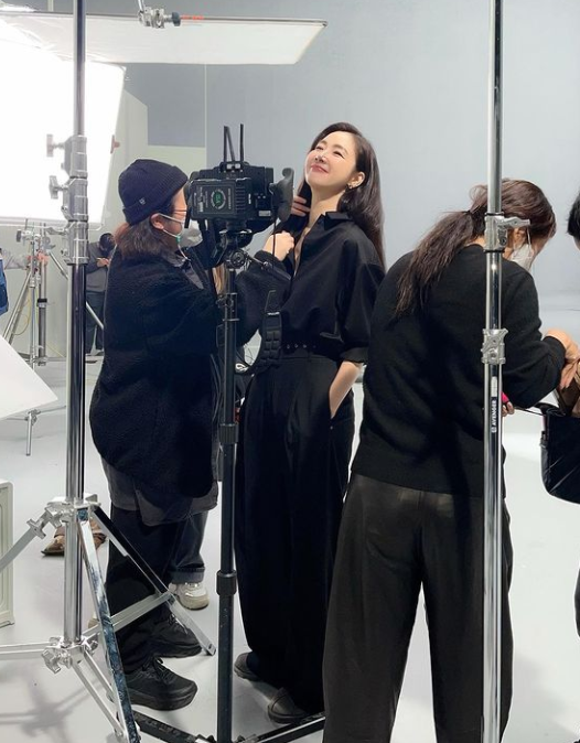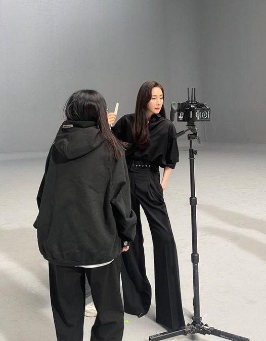사진 속 최지우는 스튜디오에서 광고 사진 촬영 준비에 한창이다. 검은색 상하의를 입은 최지우는 비현실적인 비율로 눈길을 끌었다.