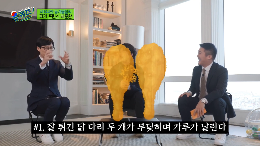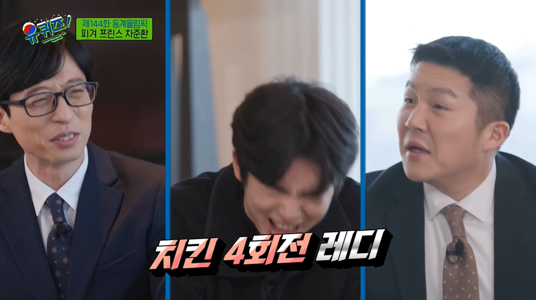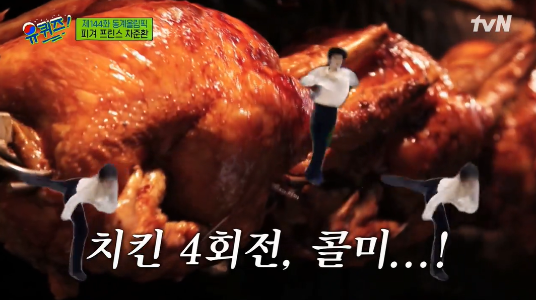 유재석은 "그 눈빛은? 치킨 4회전"이라더니 "차준환 선수가 치킨 광고 나오면 일단 예상되는 그림이 있다. 닭다리 두 개가 부딪히며 가루가 날리고, 차준환 선수 회전하는게 오버랩 되는 거다"라며 부추겼다.