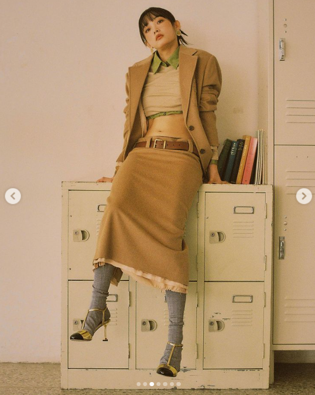 짧은 올리브그린 셔츠에 역시 짧은 베이지색 니트를 겹쳐입어 허리를 길게 드러냈다. 한편 이유미는 최근 공개된 넷플릭스 시리즈 '지금 우리 학교는'에 출연했다.