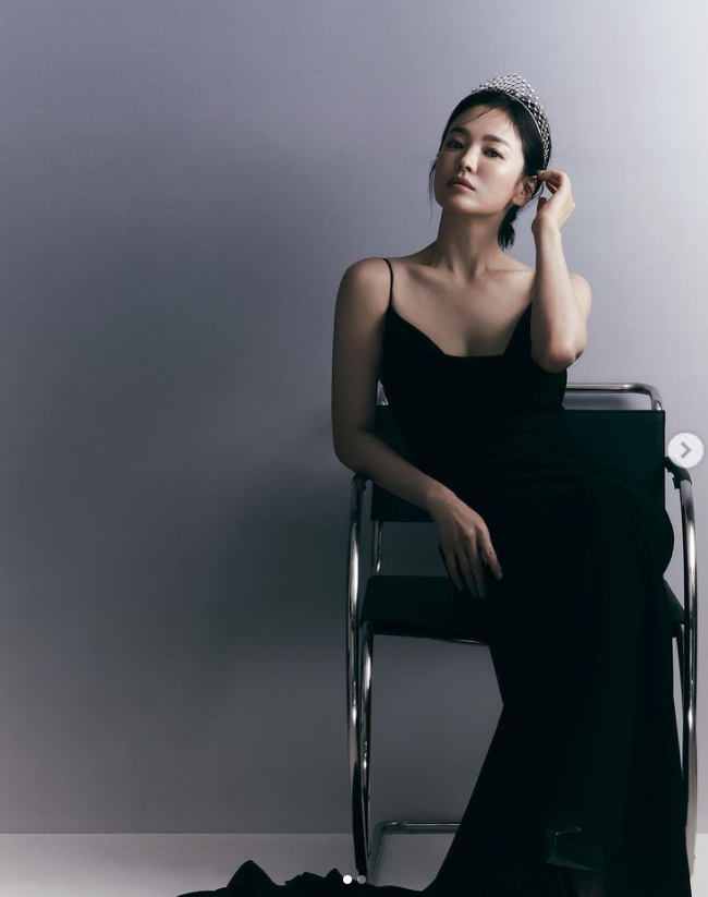 검정색 드레스 차림의 송혜교는 머리에 촘촘한 보석이 올려진 왕관을 쓰고, 우아하면서도 단호한 카리스마를 뿜어냈다.