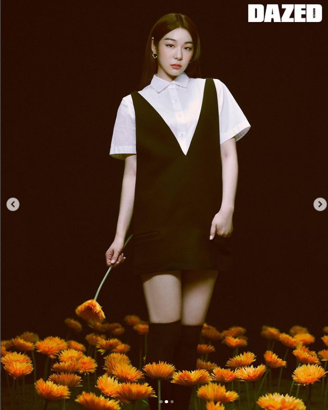 사진 속에서 김연아는 금잔화가 만발한 꽃밭에 앉아 포즈를 취했다. 하얀 셔츠에 검정 원피스, 검정 니삭스로 여학생 룩을 완성했다.
