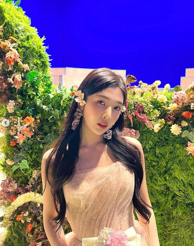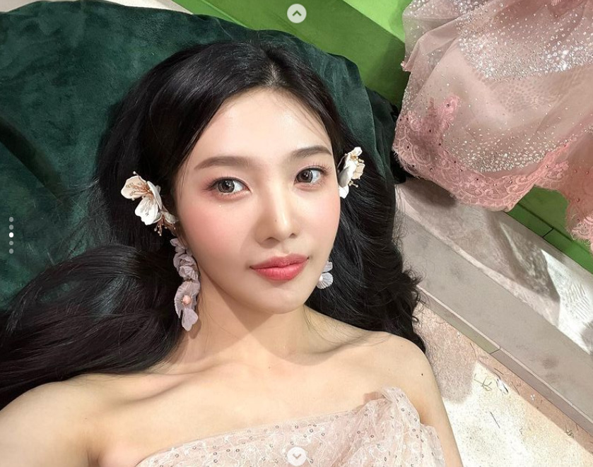 긴 머리를 고정한 건 거대한 벚꽃 모양의 머리핀과 귀걸이. 수줍은 미소와 몽환적인 표정을 오가는 조이의 모습에 동료 가수 설현도 "너무 예쁘다"며 감탄했다.