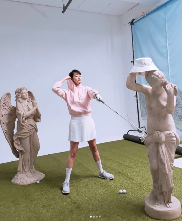 김혜수는 23일 자신의 SNS에 2개의 조각상과 함께 한 화보촬영 현장을 공개했다. 연핑크색 후드 상의에 하얀 주름치마, 하얀 니삭스 차림의 김혜수는 골프채를 들고 포즈를 취했다.