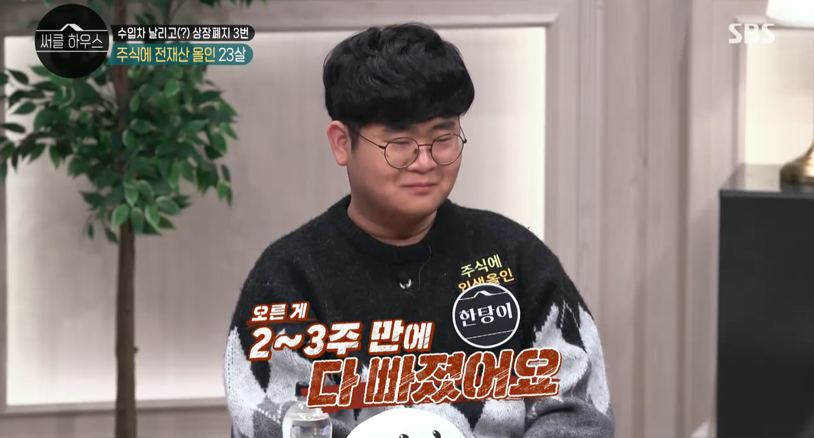 하지만 흑역사는 시작에 불과했다. 한탕이는 "상장폐지를 3번 당해서 거의 투자금 90%가 날아갔다. 나중에 휴지돼서 소각까지 됐다"라고 담담히 말했다.