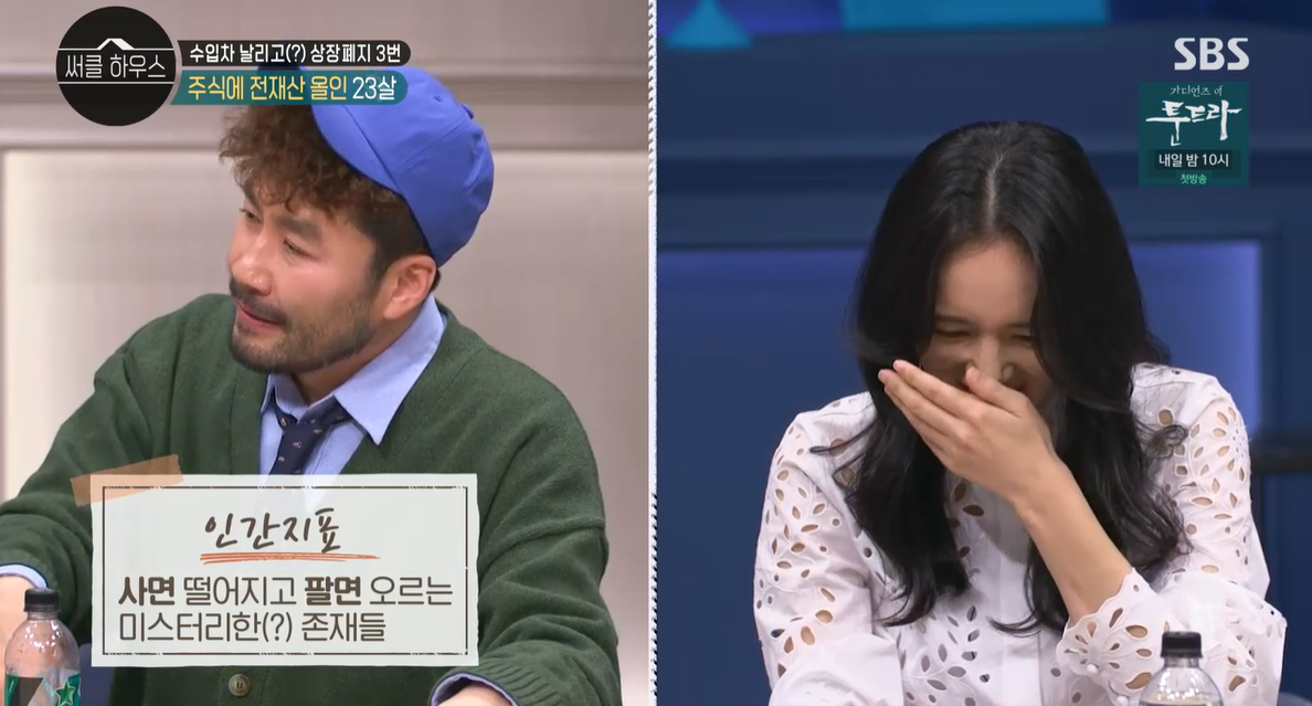 한가인은 "나도 지난 1년 동안 오른 게 2~3주에 다 빠지더라. 오를 때는 못 팔고, 팔고 나면 오르고, 다시 사고 나면 급락이다"라고 했고, 이승기도 "꼭 내 방에 누가 CCTV가 달았나 싶지 않냐"고 공감했다.