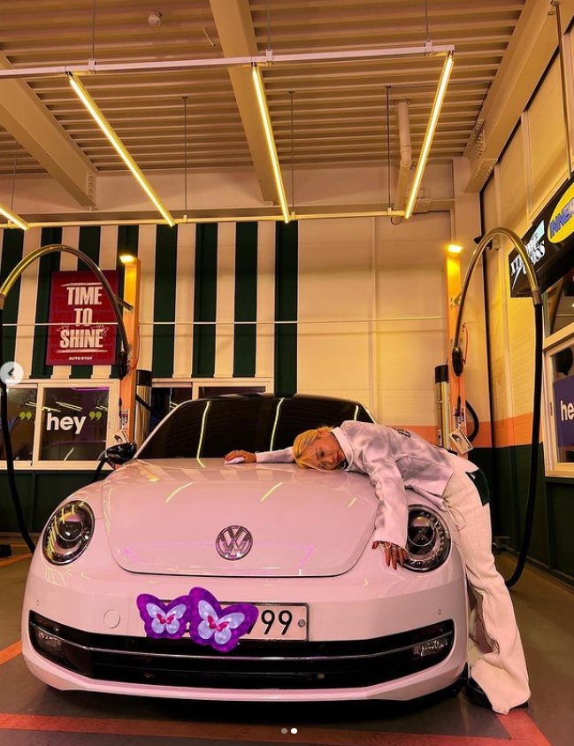 허니제이는 1일 자신의 SNS에 "잘가 꿀차(a.k.a 구구)"라는 글과 함께 하얀 폭스바겐 더비틀을 꼭 껴안고 있는 사진을 올렸다.