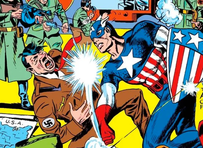 1941년 출판된 이 만화책은 총 45페이지로 공개된 표지에는 캡틴 아메리카가 갈색 양복을 입은 아돌프 히틀러에게 주먹을 날리고 있다. 영화에서 익숙한 동그란 방패와는 조금 다른 뾰족한 방패가 눈길을 끈다.