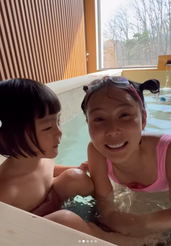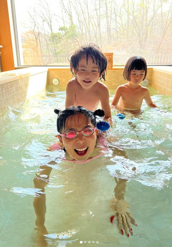 김나영은 13일 자신의 SNS에 "어떤 주말"이라는 글과 함께 자그마한 온수풀에서 아들들과 수영을 즐기는 모습을 올렸다.