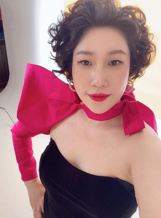 김영희는 21일 자신의 SNS에 검정 드레스에 목과 팔을 따라 핫핑크색 리본을 장식한 모습으로 사진을 올렸다.