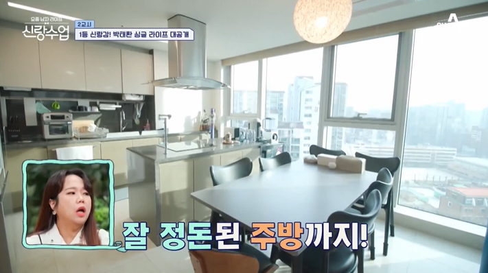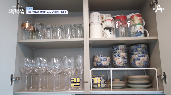 잘 정돈된 주방에 찬장 속 가득한 그릇을 보던 MC 김원희는 "여자 혼자 사는 집 같다"라며 환호를 보냈다.