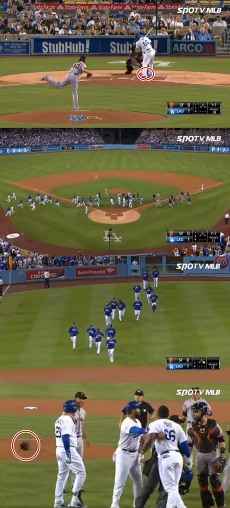 푸이그가 고통스러워 하며 주저 앉자 범가너는 그를 도발했고, 푸이그는 화를 내며 범가너에게 다가갔다. 이 모습을 목격한 양팀 선수들은 모두 그라운드로 뛰쳐 나왔고, 벤치클리어링이 발생했다. 범가너도 글러브를 던지며 기 싸움에서 지지 않겠다는 모습을 보였다.