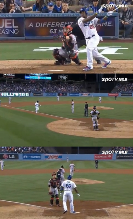 지난 5월 10일 푸이그가 범가너를 상대로 솔로홈런을 터트렸다. 출처ㅣSPOTV 방송 캡처