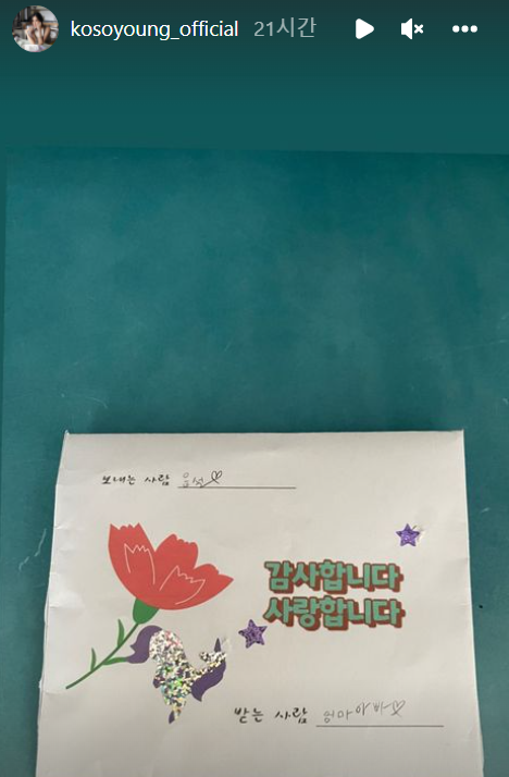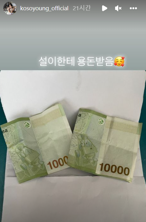 엄마 아빠 옆에 하트를 그려넣은 카드와 함께 딸이 준비한 선물은 용돈이었다. 고소영은 "설이한테 용돈받음"이라는 글과 함께 고이 접힌 2만원을 인증해 웃음을 안겼다.