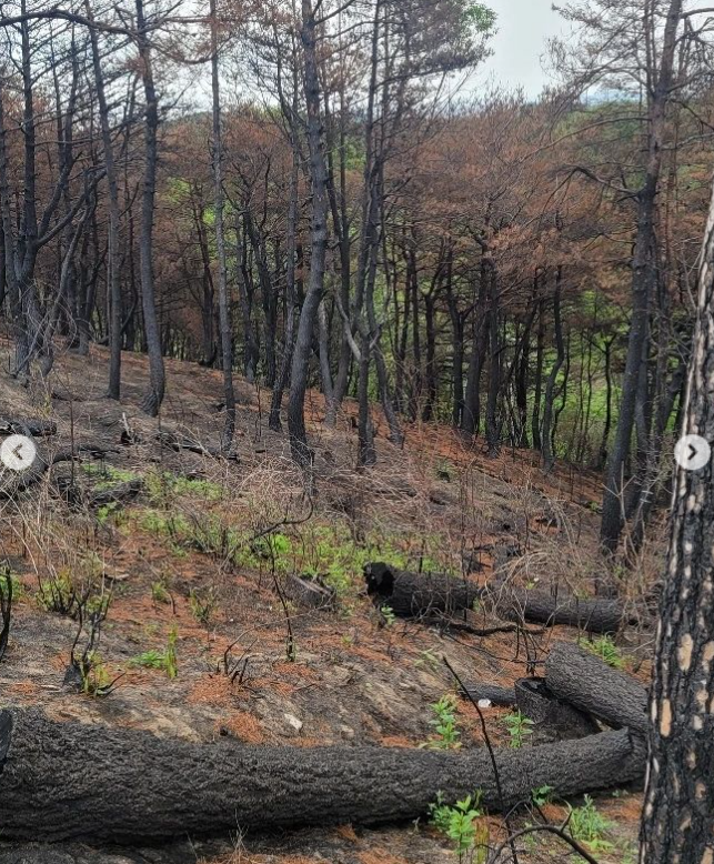 그는 "요번 산불에 엄마 산소가 모두 다 타버려서 얼마나 속이 상한지... 그래도 비가 와서 자꾸 씻겨서 탄내도 점점 없어져가고 나름 풀도 점점 자라납니다... 땅에 있는 작은 꽃. 그게 희망이란 거겠지"라며 속상한 마음을 전했다.