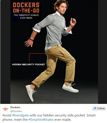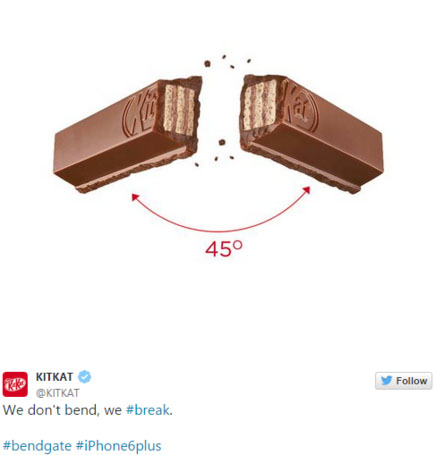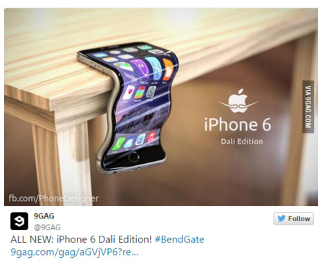 이날 과자 브랜드 킷캣은 트위터를 통해 "우리는 구부러지는 게 아니라 부러진다"는 패러디물을 게재해 눈길을 끌었으며, 청바지 브랜드 리바이스의 닥커스 또한 트위터로 "우리는 휘어짐을 피하기 위해 숨겨진 보안 주머니를 달았다"며 색다른 광고를 올려 눈길을 끌었다. 미국의 이미지 기반 소셜 미디어 사이트인 '나인개그' 트위터는 "달리 에디션"이라는 글과 함께 초현실주의 작가 살바도르 달리의 작품처럼 휘어져있는 아이폰의 사진을 게재해 네티즌의 웃음을 자아냈다.