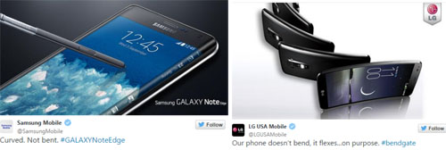 이뿐 아니라 삼성, LG 등 애플 경쟁사들의 트위터도 화제다. 이날 삼성 모바일 트위터는 "우리는 구부러진 게 아니라 원래 휘어져 있다"는 글을 게재했으며 LG USA 모바일 또한 "우리의 핸드폰은 구부러지는 게 아니라 의도적으로 휘어진다"고 꼬집었다.
