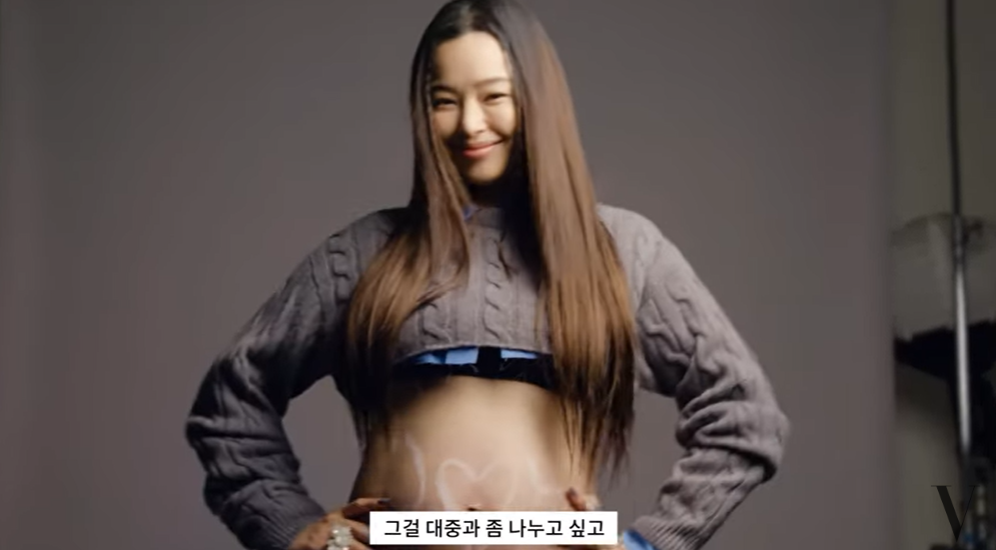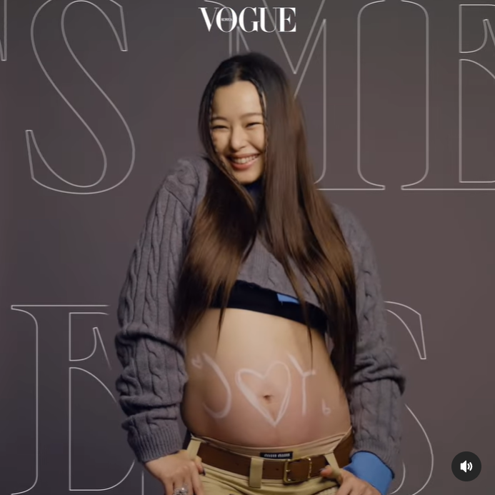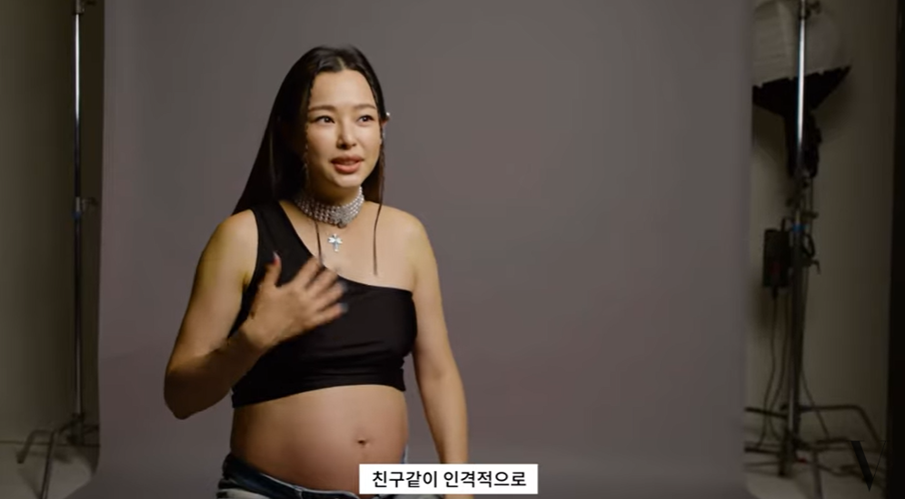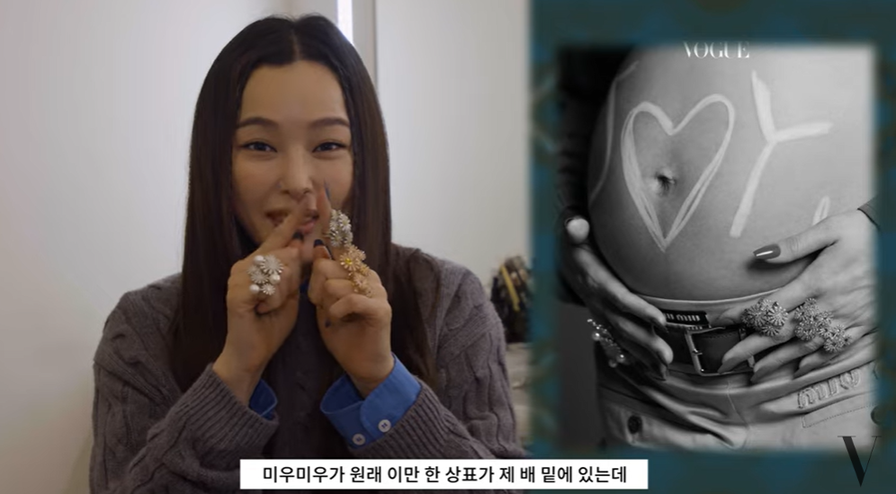 그는 "미우미우로 만삭 컷 찍은 사람은 아마 저밖에 없을 거다. 원래 요만한 상표인데, 내가 배가 커가지고 이렇게 늘어난 상태다"라고 손가락을 쭉 벌리며 깔깔 웃었다.