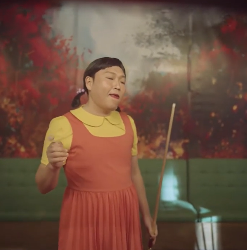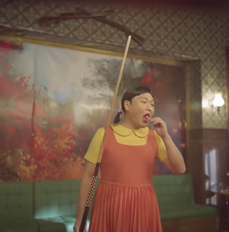 넷플릭스 최고 화제작 '오징어게임'의 술래 영희로 분한 싸이는 사탕을 담배처럼 문 채 큐대를 들고 포켓볼을 친다. 거들먹대는 표정에 강렬한 표정연기까지 코믹함이 넘쳤다.