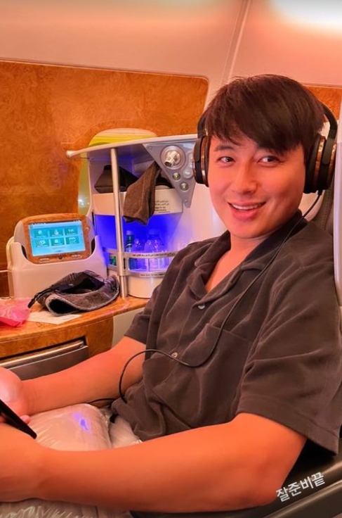 다른 사진에는 비행기 좌석에 착석한 이지훈이 헤드폰을 낀 채 잘 준비를 마친 모습이 담겨있다.