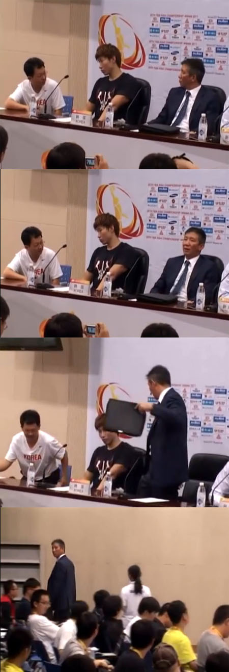 지난 2011년 중국 우한에서 열린 국제농구연맹(FIBA) 아시아 남자농구선수권 대회 준결승전에서 개최국 중국에 패한 한국의 허재 감독을 향해 한 중국 기자가 "중국 국가가 나오는데 왜 한국 선수들의 자세가 흐트러졌느냐"는 질문을 던졌다. 허재 감독은 통역을 통해 질문을 이해하자마자 "뭔 소리야. 말 같지도 않은 소리를 하고 그래. **, 짜증 나게"라고 화를 버럭 내며 기자회견장을 박차고 나갔다. 자리를 떠나는 허재 감독에게 어떤 중국 기자가 집에 가라는 의미의 "Go back home"이라는 말을 꺼냈다가 허재 감독의 레이저 눈빛을 맞기도 했다. 그뿐만이 아니라 허재 감독을 비롯한 한국 선수단이 대회 기간에 들은 황당 질문이 넘쳐난다. 질문을 나열하자면 "허재 감독 당신은 유명한 3점 슈터였는데 한국의 외곽슛 성공률은 왜 낮았느냐", "경기 전에 중국 홈경기라 판정이 불리할 수 있다고 했는데 오늘 진 것도 그렇게 생각하느냐", "한국 선수들은 왜 중국에서 라면을 먹느냐" 등이 있다. 허재 감독은 공식 석상에서 화끈한 행동을 보여준 후 한 매체와의 인터뷰에서 당시 심경을 전했다. 허재 감독은 "구체적으로 말씀드리면 경기와 관련된 질문을 했어야 되는데 한국농구를 비아냥거리고 우리 선수들의 안 좋은 부분들을 계속 얘기하기에 화가 났다"라며 설명했다. 이어 "박차고 나온 상황을 후회한다기보다는 조금 더 참았어야 되는데 참지 못하고 나온 게 약간 아쉬운 것 같다"라며 "다시 그 상황으로 돌아간다면 다른 방법을 썼을 것 같다"라고 말했다. 그러나 "중국과의 안 좋은 감정을 풀고 싶은 생각은 없다"라고 잘라 말했다.