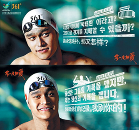 '361°' 홈페이지 광고 사진은 더 도발적이다. 쑨양의 사진 옆으로 한글과 중국어로 "수영장 이름이 '박태환'이라고? 그런다고 경기를 지배할 수 있을까?"라고 적혀 있다. 또 다른 사진은 "당신은 그들의 기록을 깼지만 저는 당신의 기록을 깹니다"라는 문구를 담고 있다.
