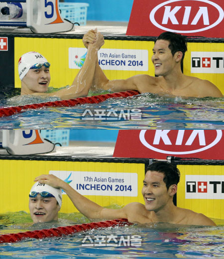 2014 아시안게임 남자 200m 자유형 결승전에서 나란히 은메달과 동메달을 차지한 쑨양과 박태환.사진 | 박진업기자 upandup@sportsseoul.com