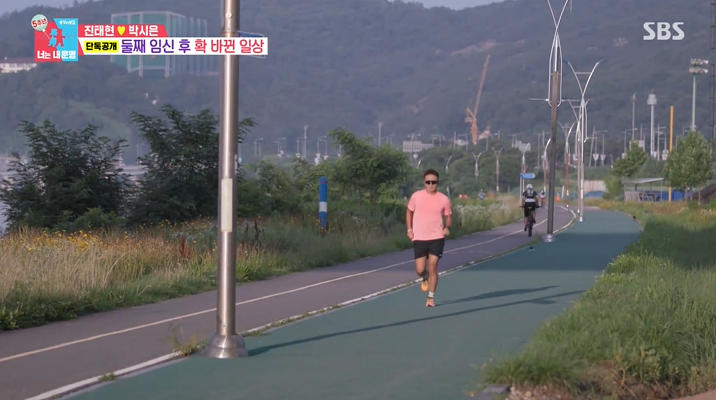 아침잠 없기로 유명한 진태현은 여전히 새벽에 일어나 한강공원 러닝에 나섰다. 진태현은 "아내하고 건강하게 뛰어야겠다는 생각으로 시작한 러닝이었다. 갑자기 아이가 생겨서 와이프는 못 뛰고 저만 뛰고 있는데 이젠 정말 익숙해져서 10km는 기본이다. 30kg까지 뛰어봤다"고 설명했다.