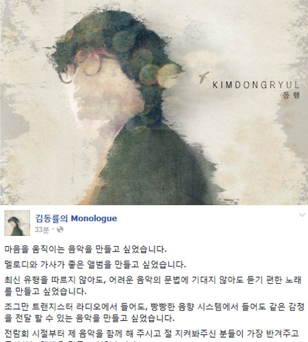 김동률은 30일 자신의 페이스북을 통해 "마음을 움직이는 음악을 만들고 싶었습니다"로 시작하는 장문의 글을 게재했다.