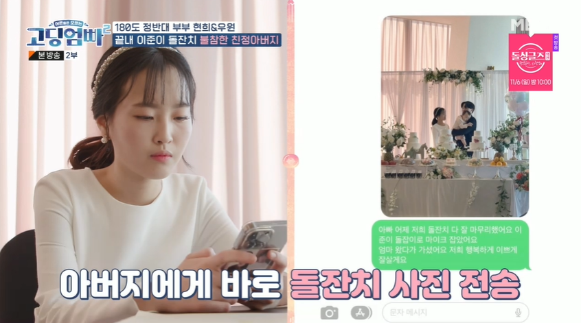 결국 돌잔치가 끝난 뒤 유현희는 바로 친정아버지에게 찍은 가족사진을 보냈다. 유현희는 '아버지가 무섭게 대하는 데도 좋아요?'라는 제작진의 물음에 "네"라고 답하면서 "모르겠어요. 말로 표현을 못 하겠다. 맨날 싸우고 혼나면 어색하다. 아빠가 '이제 아빠 싫지?'라면 솔직히 싫은 마음은 없는데 설명하기 어렵다. 제일 무섭고 제일 어렵지만 가장 저를 생각해 주는 사람이다"고 털어놨다.
