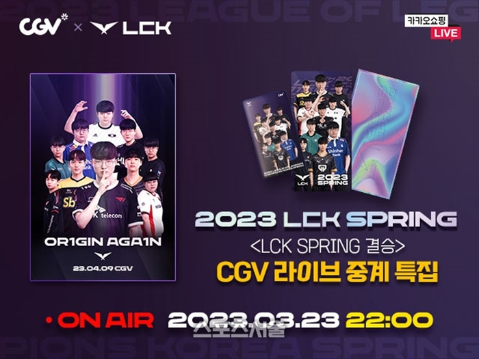 CGV는 4월 9일 오후 3시 잠실종합운동장 실내체육관에서 진행하는 ‘2023 LCK 스프링’ 결승전을 CGV강남, 강변, 용산아이파크몰 등 전국 33개 극장에서 생중계한다. ‘2023 LCK 스프링’은 2023년 1월 18일 개막해 총 10개 팀이 참가했다. 각 팀은 3월 19일까지 치열한 예선전을 펼쳤고, 3월 22일부터 플레이오프 경기를 진행 중에 있다.