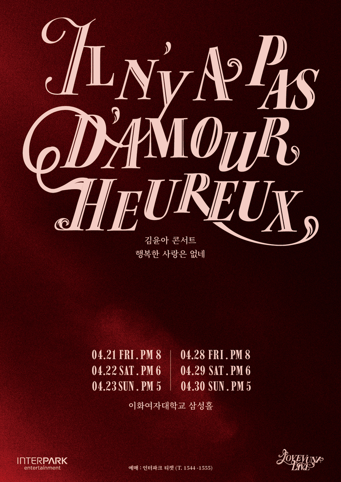 25일 소속사 인터파크 엔터테인먼트는 “김윤아가 다음달 7일 라이브앨범 ‘행복한 사랑은 없네’를 발매하고 동명의 솔로콘서트를 개최한다”고 밝혔다.