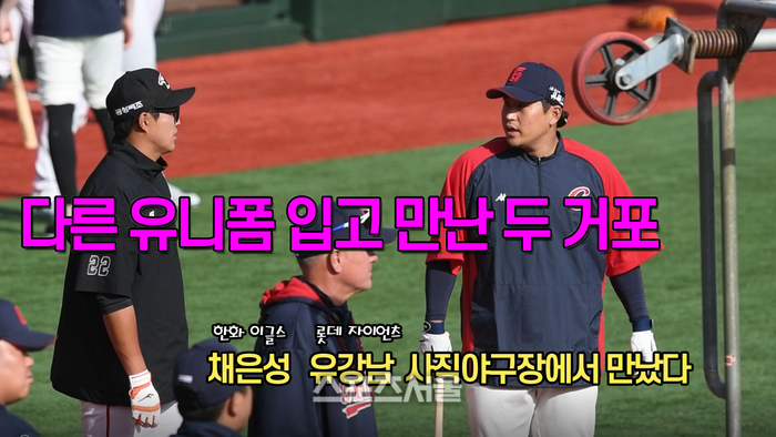 [스포츠서울 부산=최승섭기자] LG에서 한솥밥을 먹던 한화 채은성과 롯데 유강남이 다른 유니폼을 입고 25일 사직야구장에서 만났다.