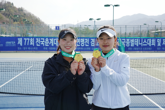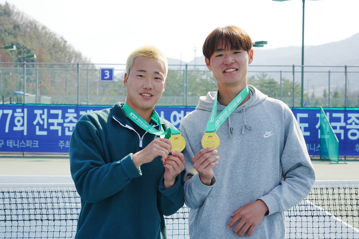 [스포츠서울 | 박준범기자] 강준수-곽호민(이상 한국교통대) 조와 문정-신혜서(이상 한국체대) 조가 제77회 전국춘계대학테니스연맹전 남녀 복식에서 정상에 올랐다.