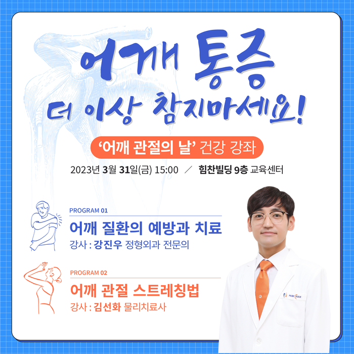 이번 강좌는 매년 3월 마지막 주 목요일이 ‘어깨 관절의 날’로 지정됨에 따라 이를 기념해 열리는 행사다. 평소 만성적인 어깨 통증에 시달려온 환자들에게 통증의 원인과 만성적인 어깨 통증 발생 시 대처법, 어깨 관절 관리법 등 어깨 통증 및 질환에 대한 자세한 정보를 얻을 수 있다.