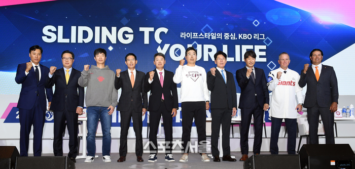 30일 서울 용산구 그랜드하얏트서울호텔에서 진행된 2023 KBO 미디어데이 행사에서 각 팀 감독들이 취재진을 향해 포즈를 취하고 있다. 왼쪽부터 두산 이성엽 감독, 삼성 박지만 감독, KIA 김종국 감독, LG 염경엽 감독, SSG 김원형 감독, 키움 홍원기 감독, KT 이강철 감독, NC 강인권 감독, 롯데 래리 서튼 감독, 한화 카를로스 수베로 감독. 2023. 3. 30.