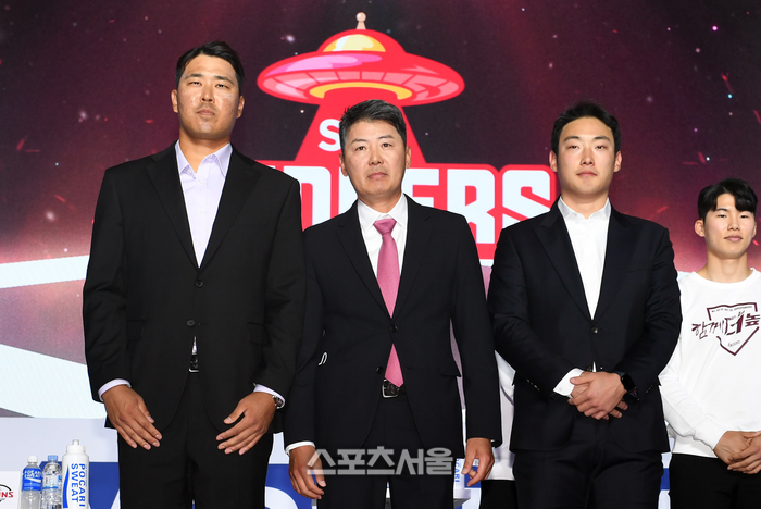 SSG 김원형 감독(가운데)과 한유섬(왼쪽), 최지훈이 30일 서울 용산구 그랜드하얏트서울호텔에서 진행된 2023 KBO 미디어데이 행사에서 취재진을 향해 포즈를 취하고 있다. 2023. 3. 30.