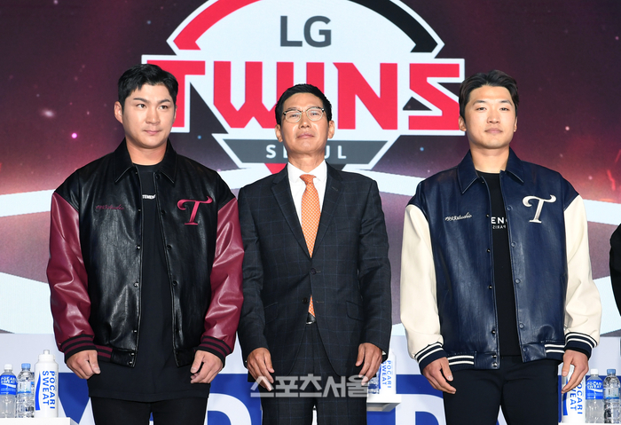 LG 트윈스 염경엽 감독 감독(가운데)과 오지환(왼쪽), 박해민이 30일 서울 용산구 그랜드하얏트서울호텔에서 진행된 2023 KBO 미디어데이 행사에서 취재진을 향해 포즈를 취하고 있다. 2023. 3. 30.