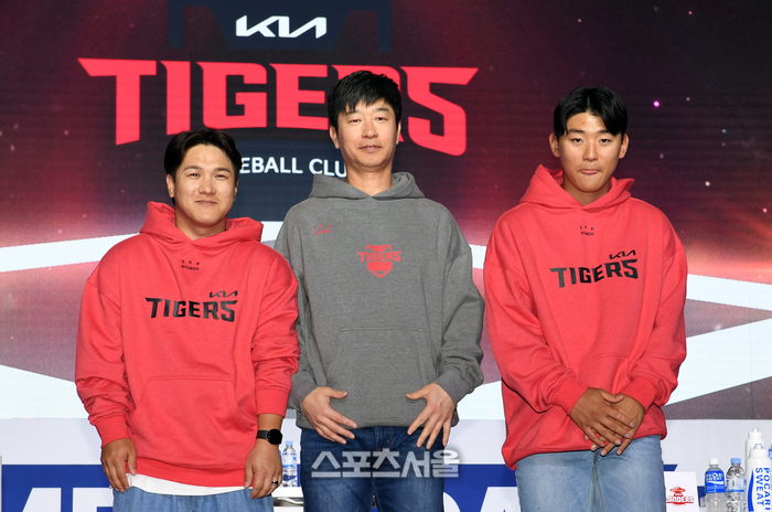 KIA 타이거즈 김종국 감독(가운데)과 김선빈(왼쪽), 김도영이 30일 서울 용산구 그랜드하얏트서울호텔에서 진행된 2023 KBO 미디어데이 행사에서 취재진을 향해 포즈를 취하고 있다. 2023. 3. 30.