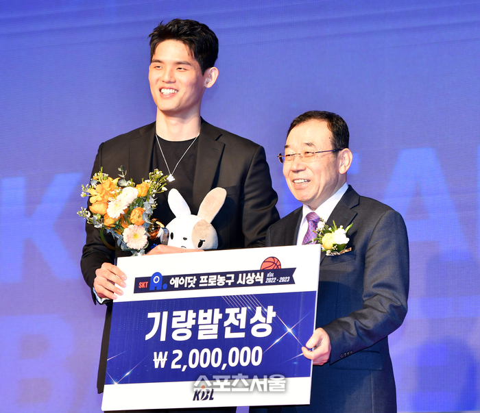 기량발전상을 수상한 KT 하윤기가 30일 삼성동 인터콘티넨탈호텔에서 열린 2022-23SKT 에이닷 프로농구 시상식에서 상을 수상한 후 기념촬영을 하고 있다. 2023.03.30.